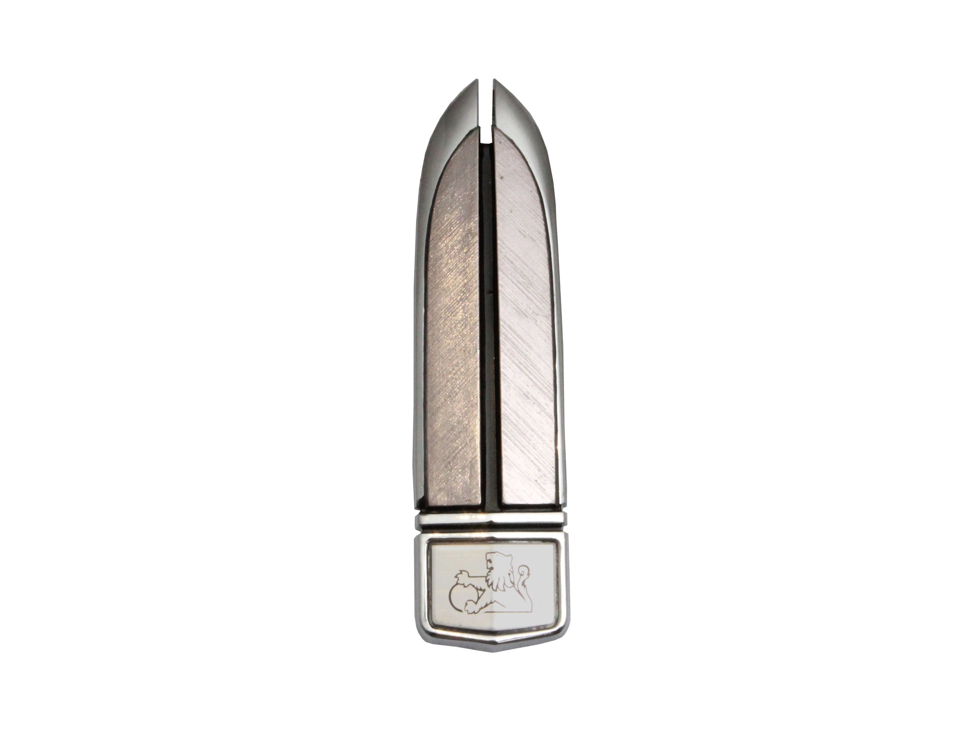 “Emblem CALAIS” (Name plate/emblem/lion) silver with black inlay badge which goes on the front panel (nose cone) on a VL and guard (fender) on a VK above the Calais badge and on the the bonnet (Hood) of a VN, this is a peel and stick type badge.
