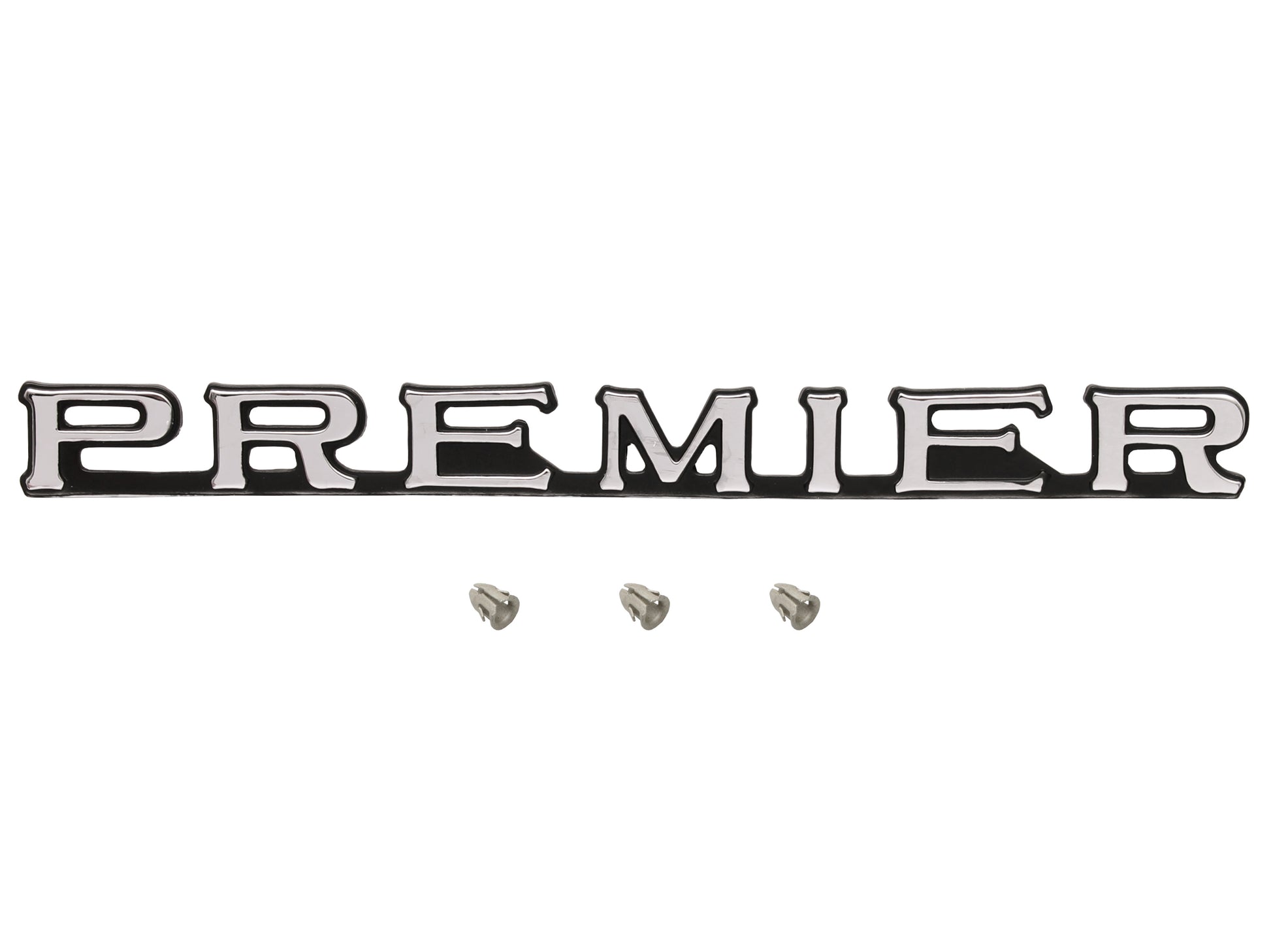 “Premier” Alloy die cast chrome finish Badge (Name plate/Emblem) which fits the fender (guard), tailgate or boot Lid (Deck lid) This badge is supplied with barrel clips to go into the panel, to hold the badge to the car.