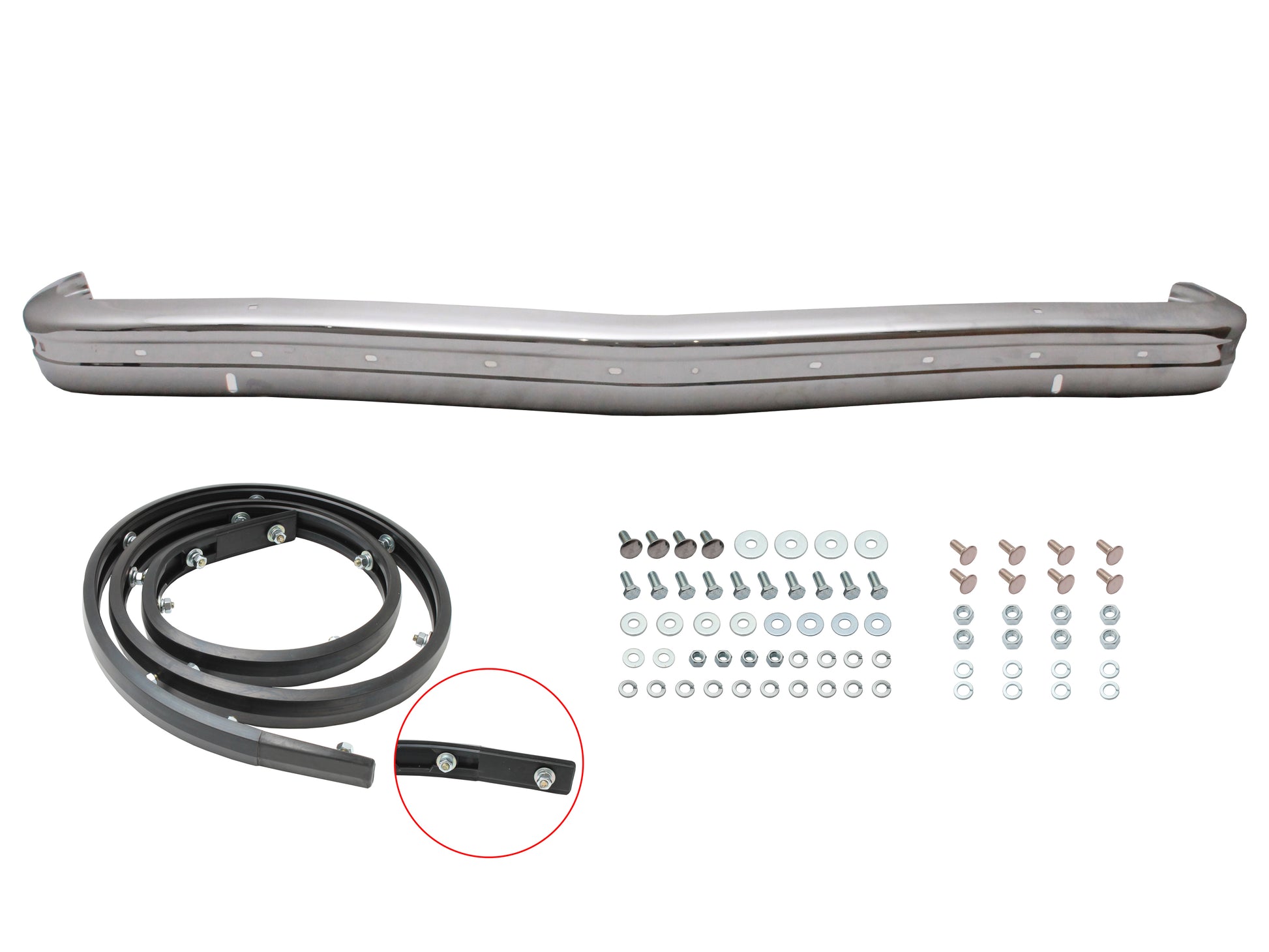 Includes rubber bumper strip, bumper bar bracket bolts and chrome bumper bar bolts