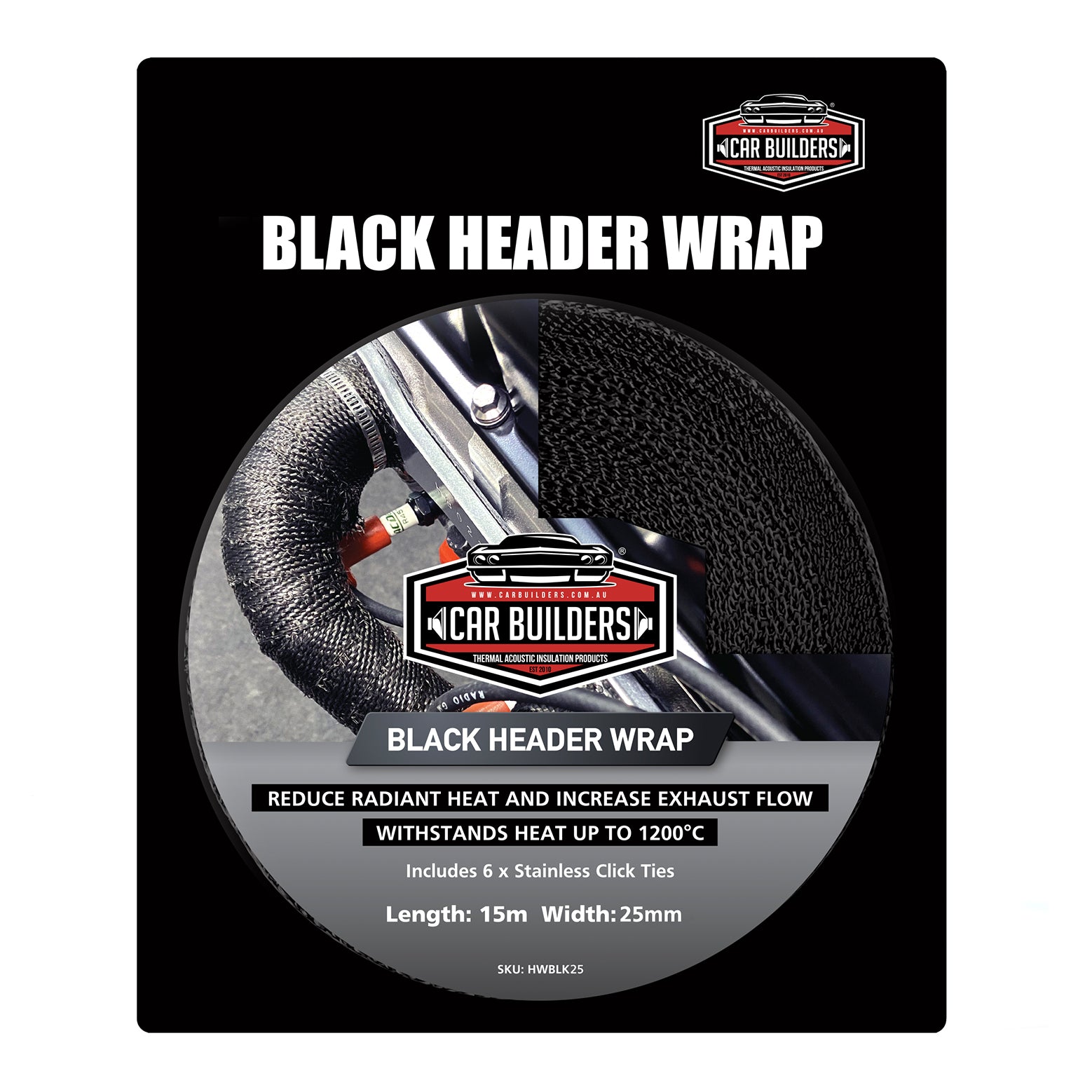 Upgrade your exhaust system with Car Builders Premium Black Titanium Exhaust Header Wrap — the ultimate choice for high-performance thermal management and durability.