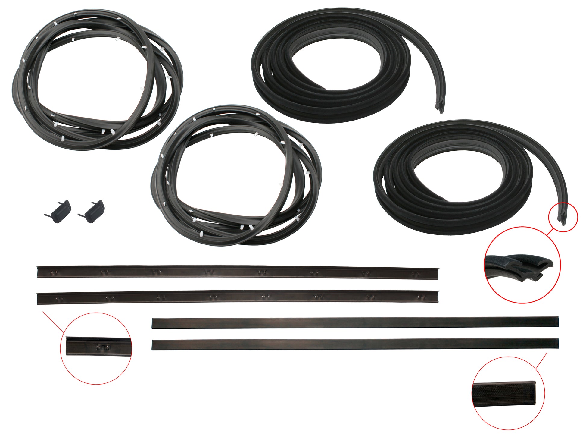 Includes all available rubber components for both front doors, except door handle gaskets (available separately)