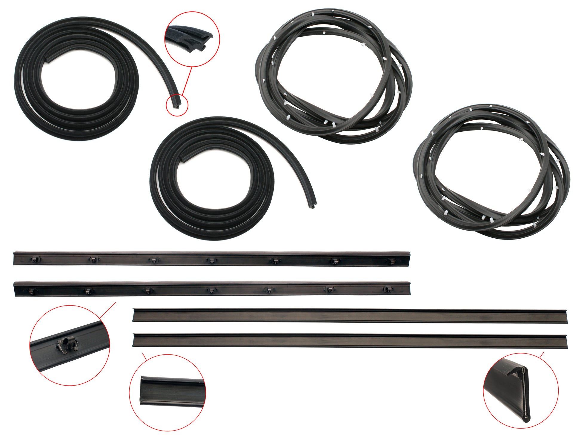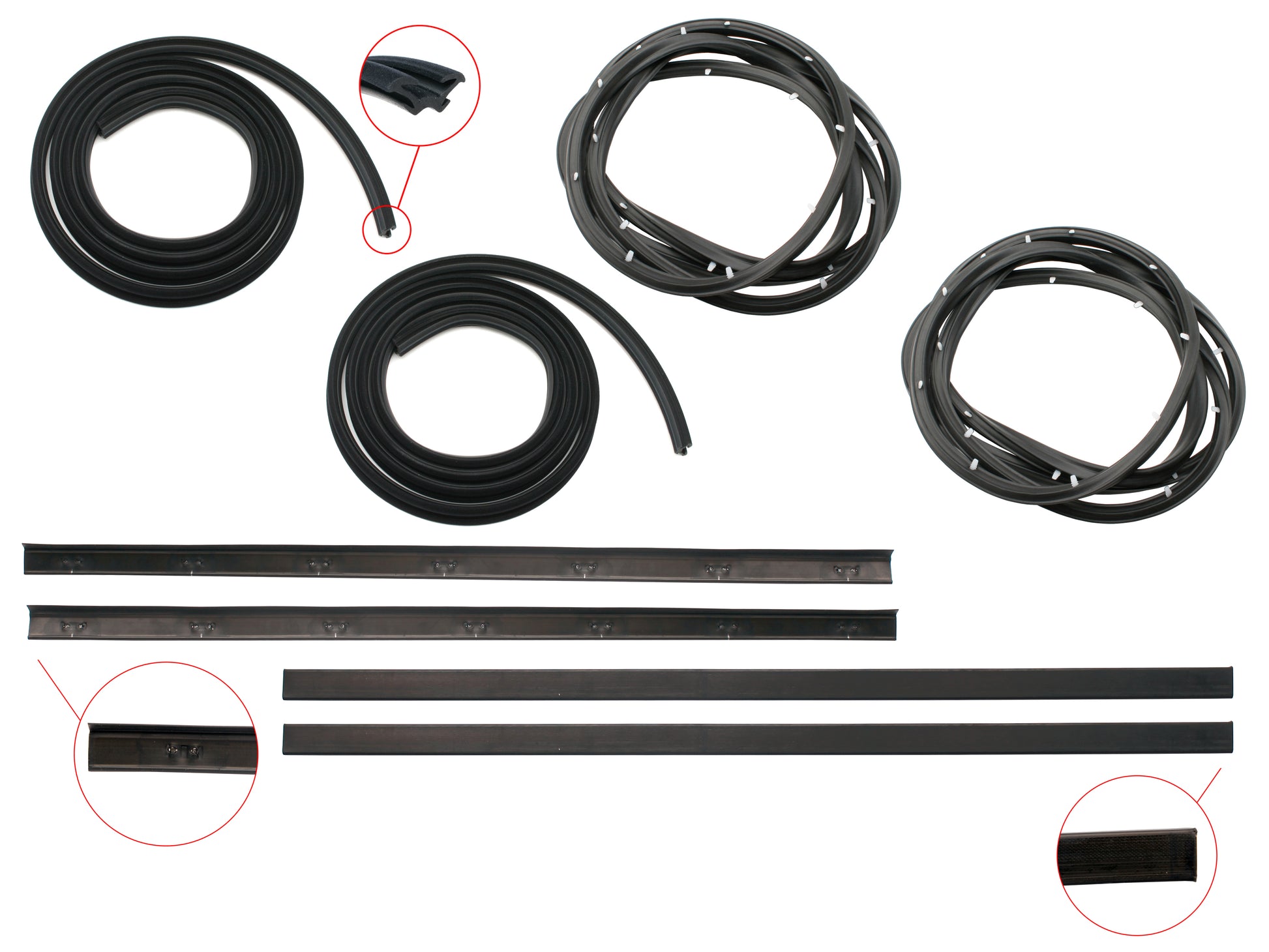 Includes all available rubber components for both rear doors, except door handle gaskets (available separately)