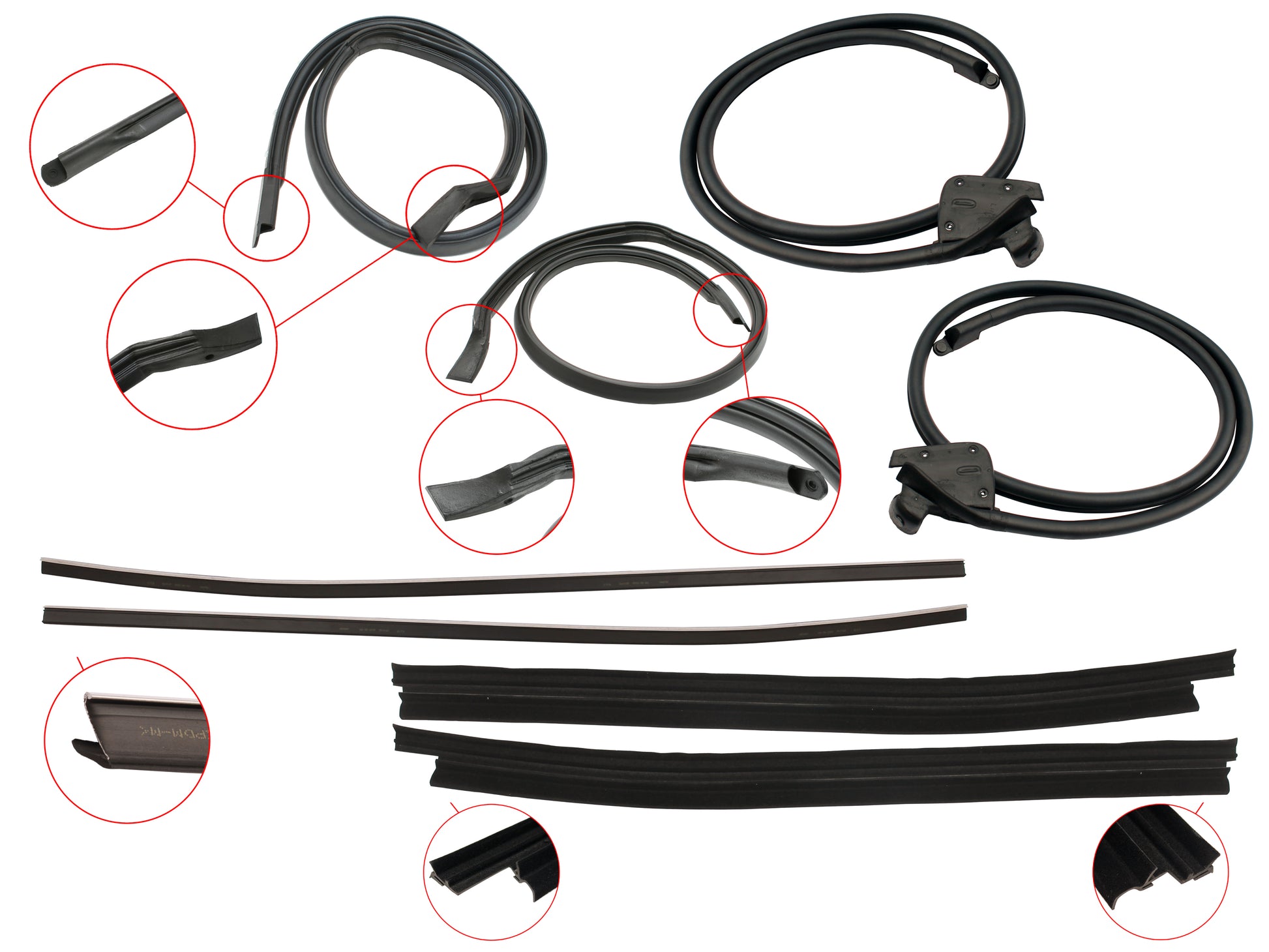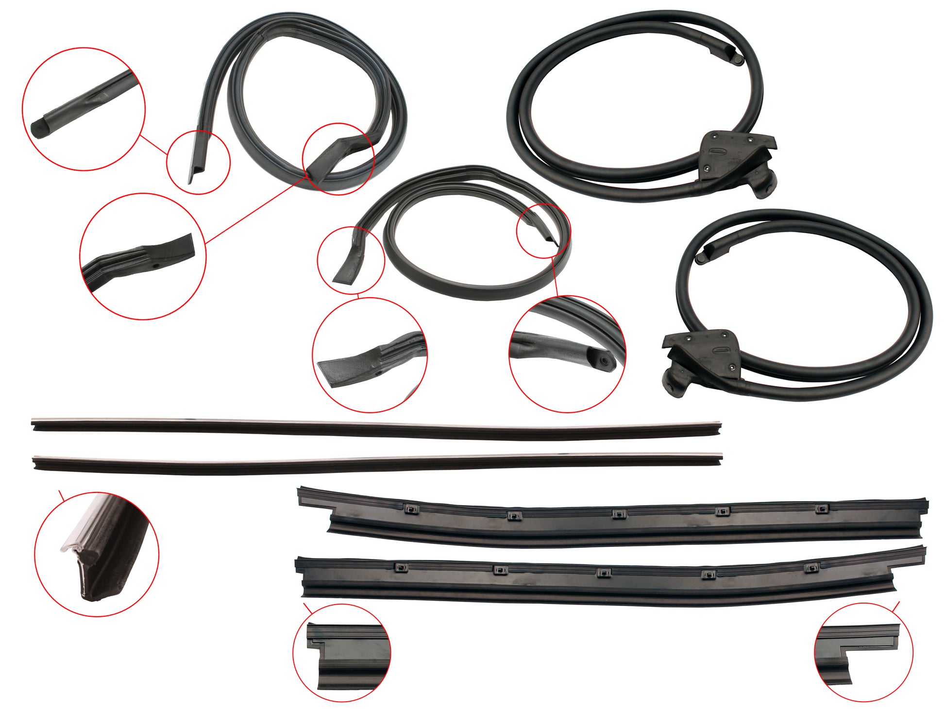 Includes lower door seals, inner/outer door belts and roof rail seals for both doors