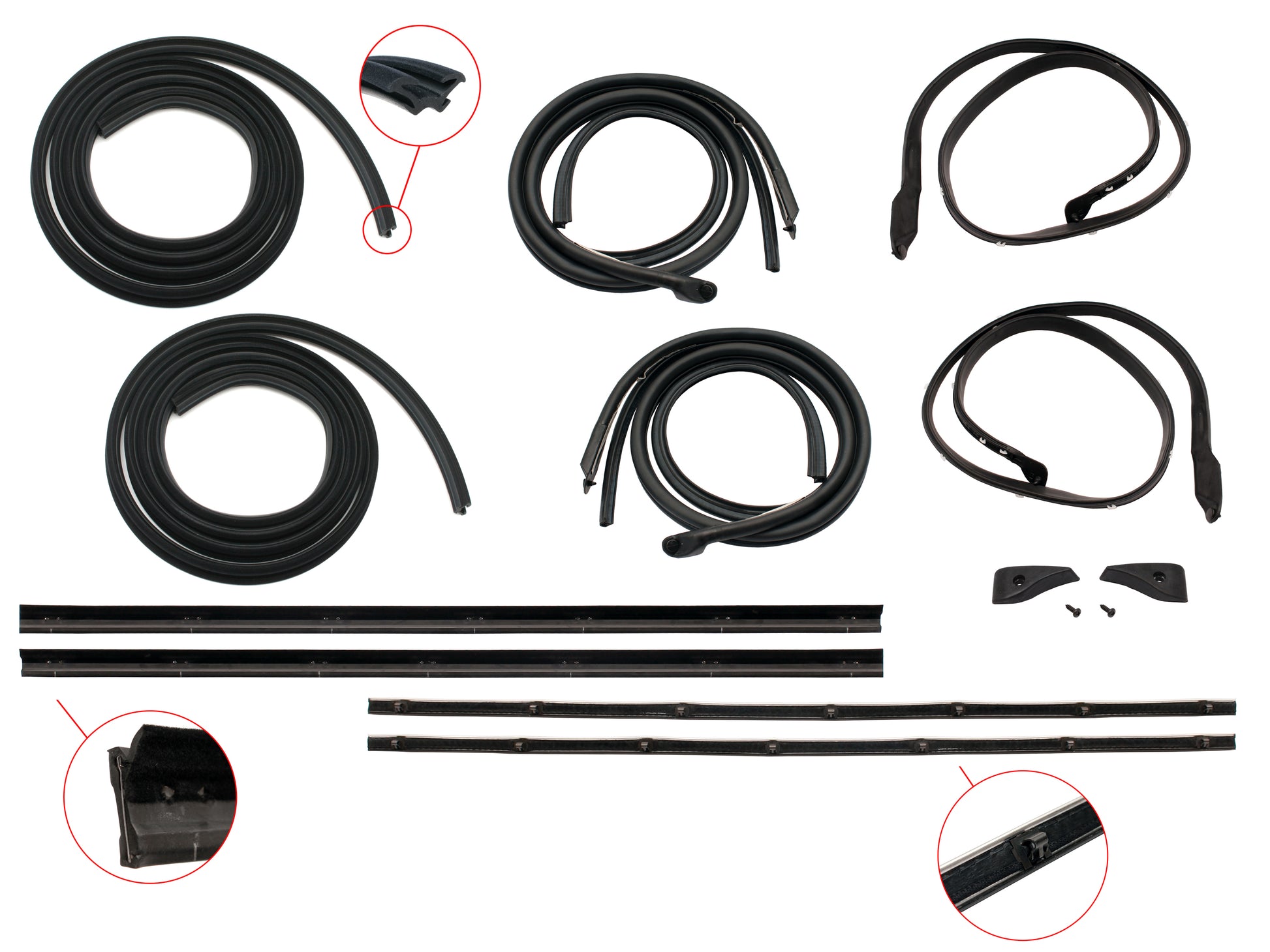 Includes upper/lower door seals, inner/outer door belts and bailey channel for both front doors