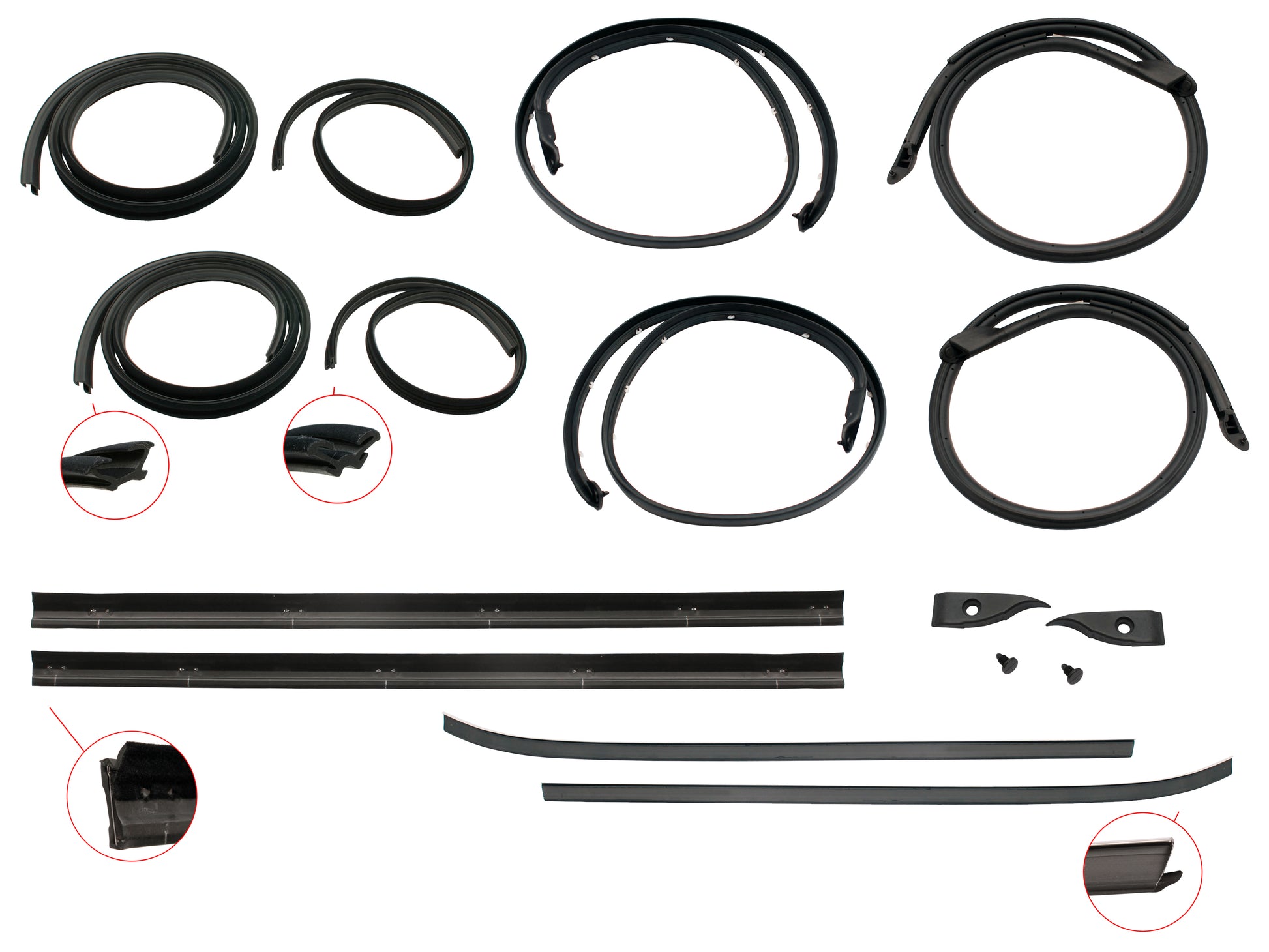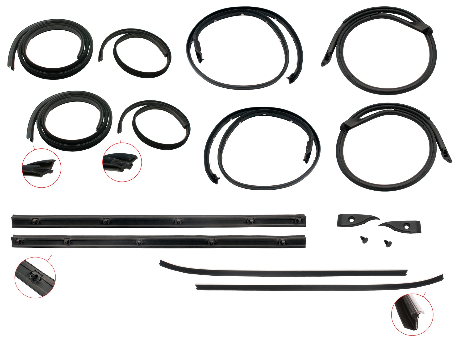 Includes upper/lower door seals, inner/outer door belts and bailey channel for both rear doors