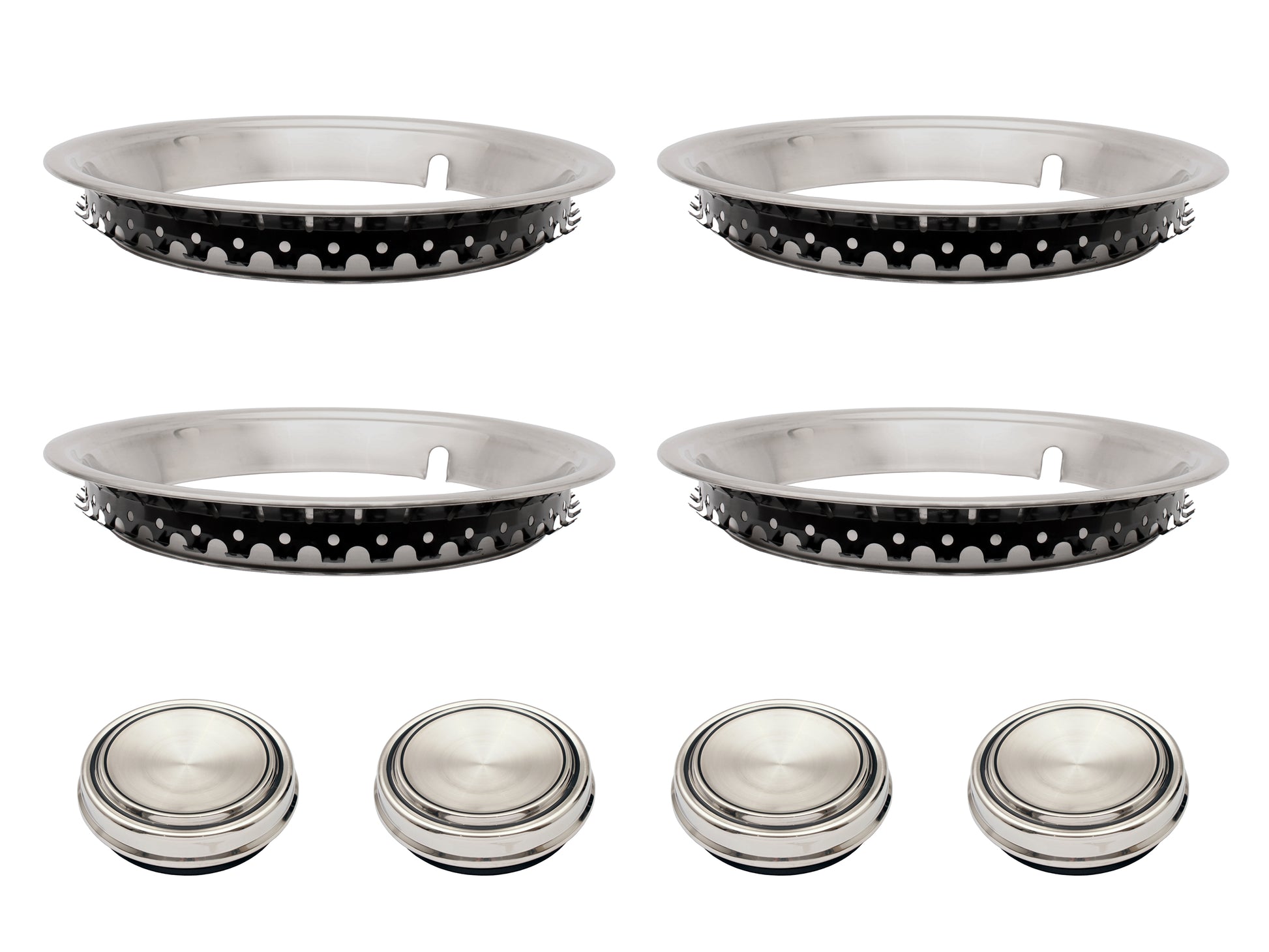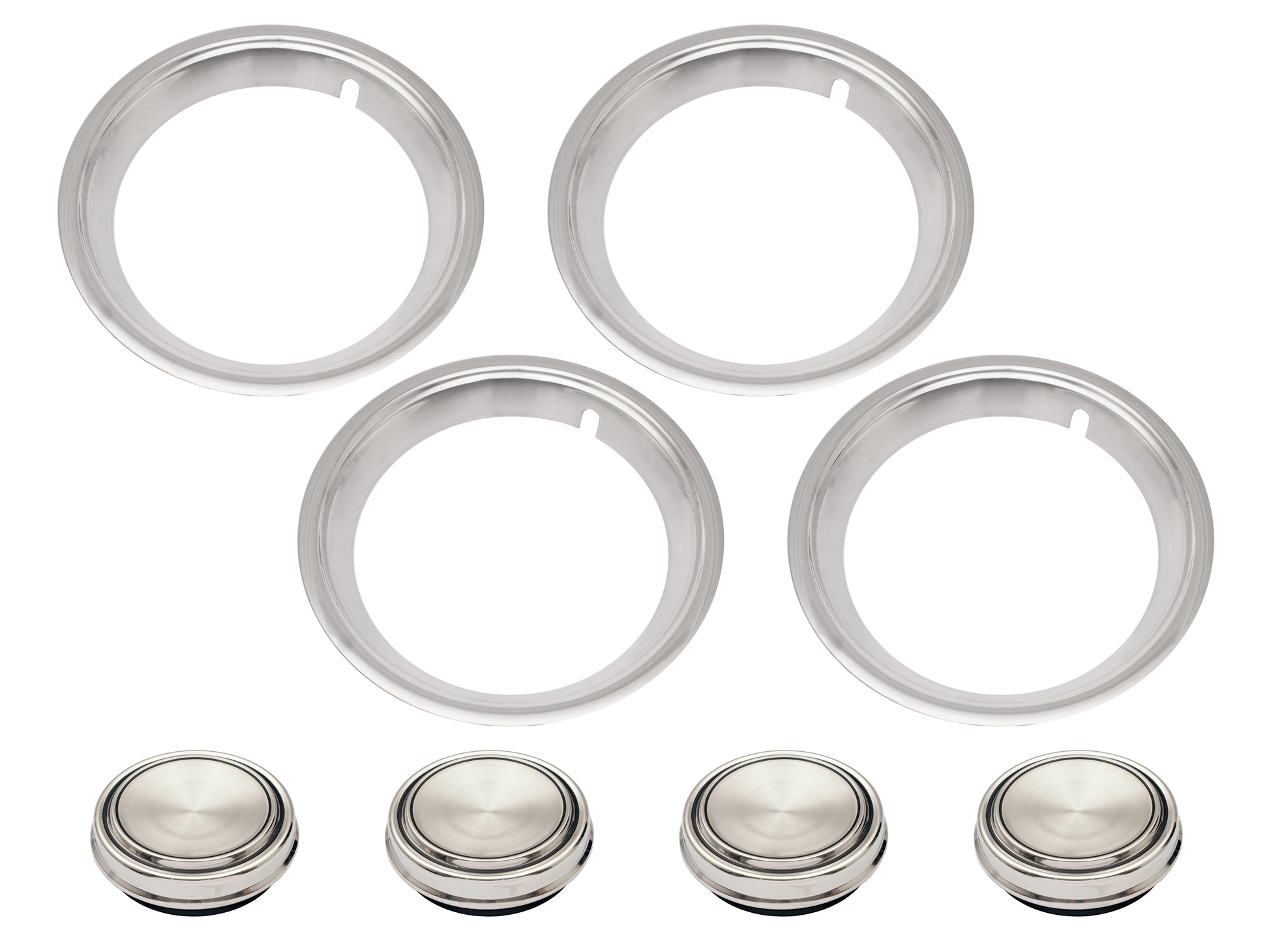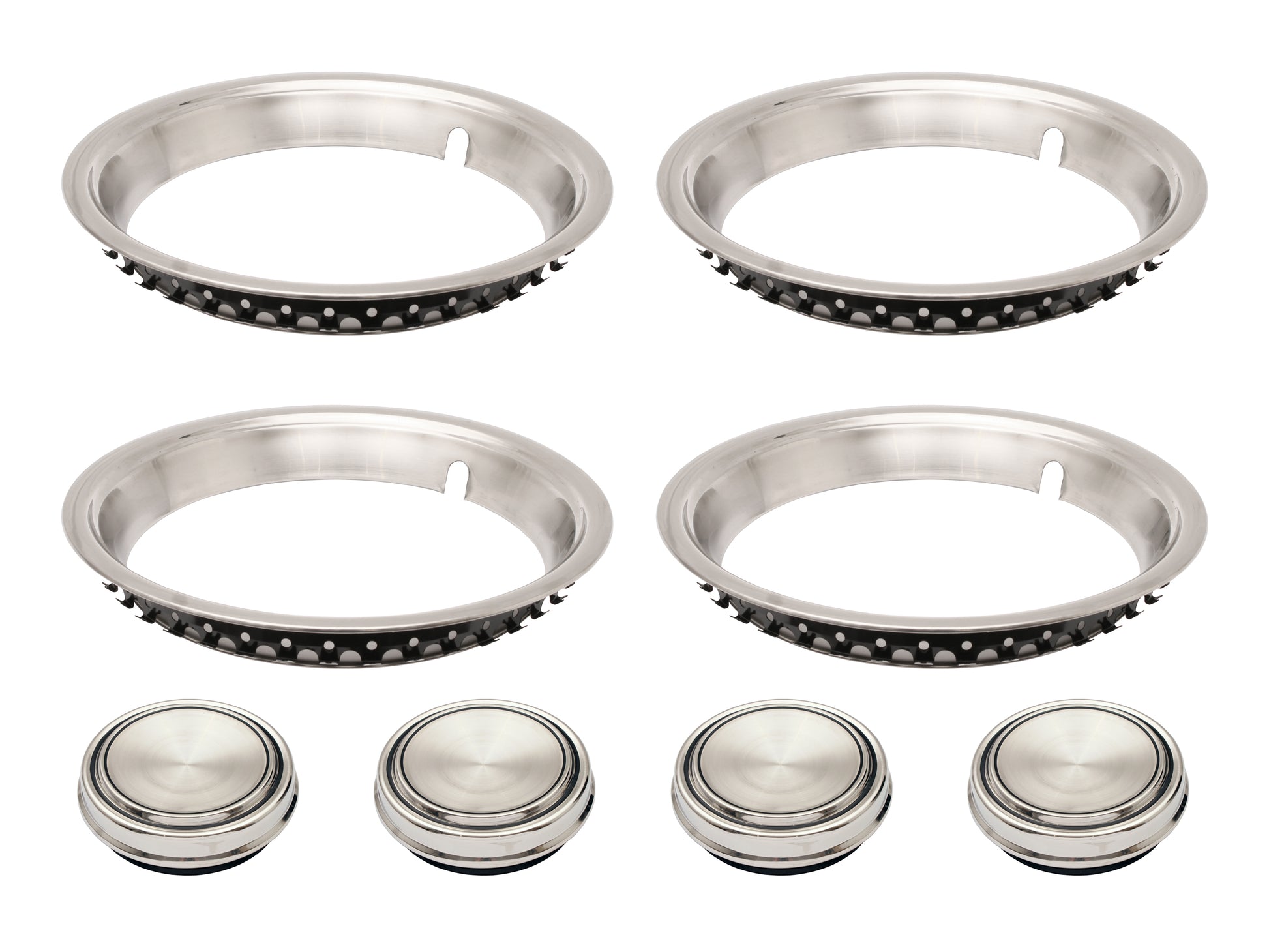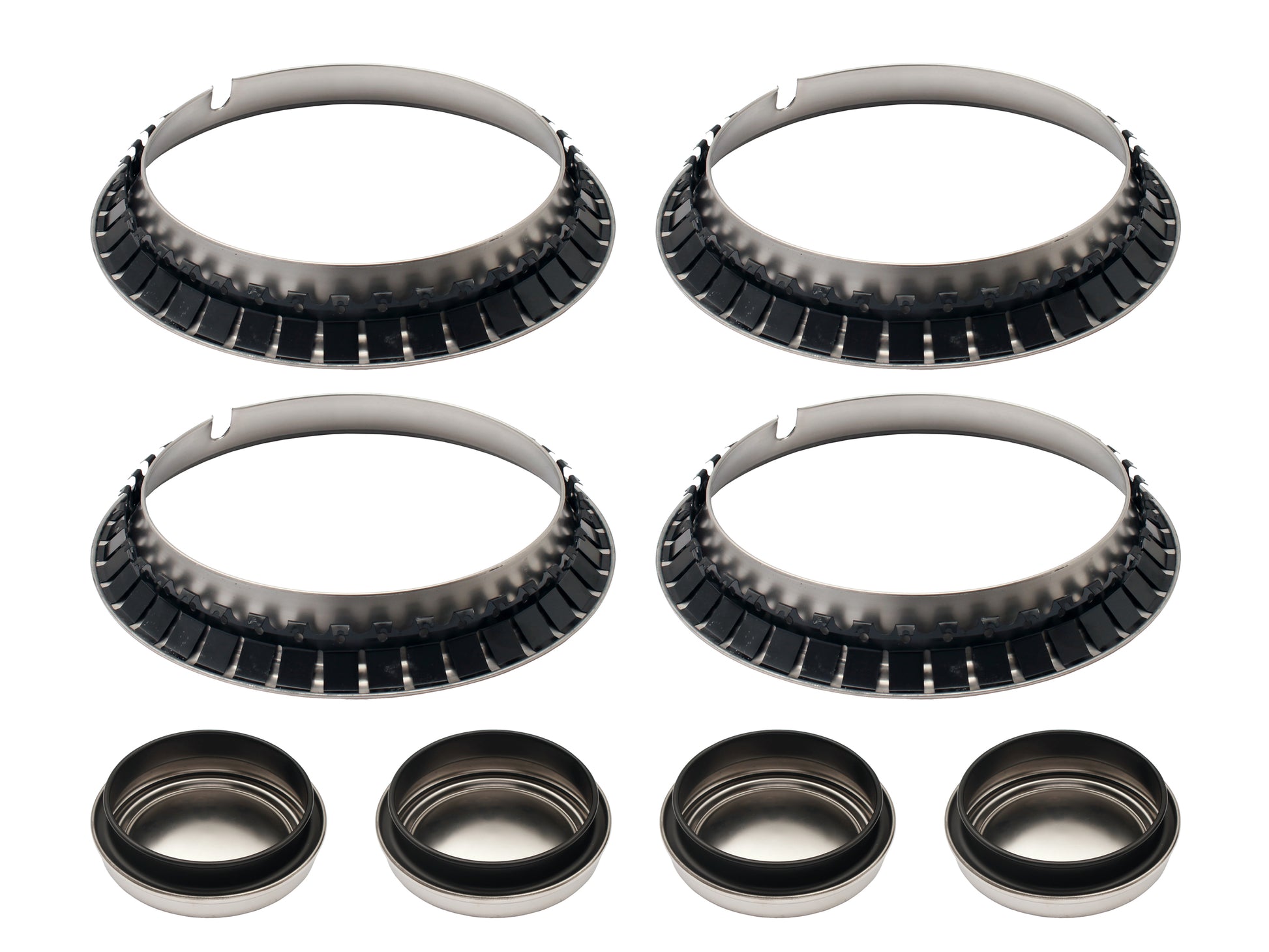 Complete kit for 4 wheels: Includes wheel trims and centre caps designed for one axle, suitable for 5 slot or 12 slot rim configurations.
