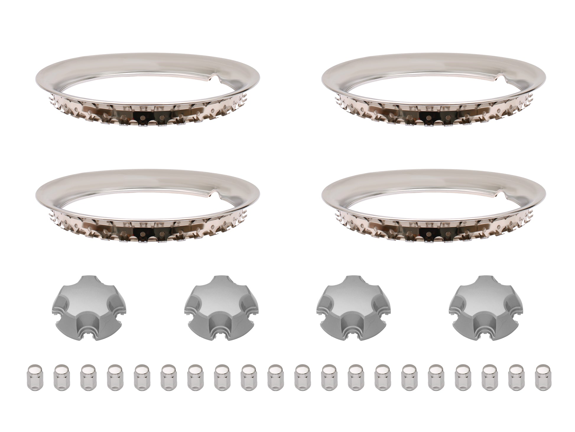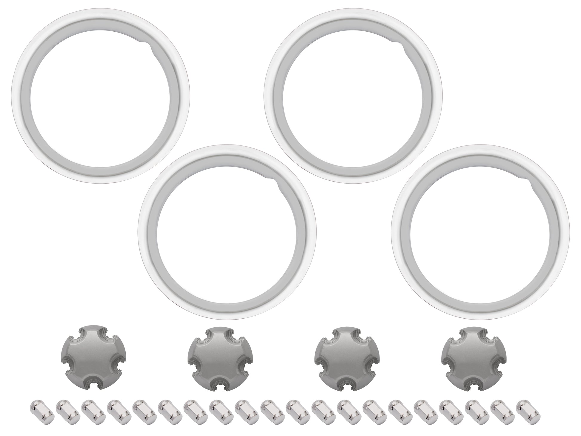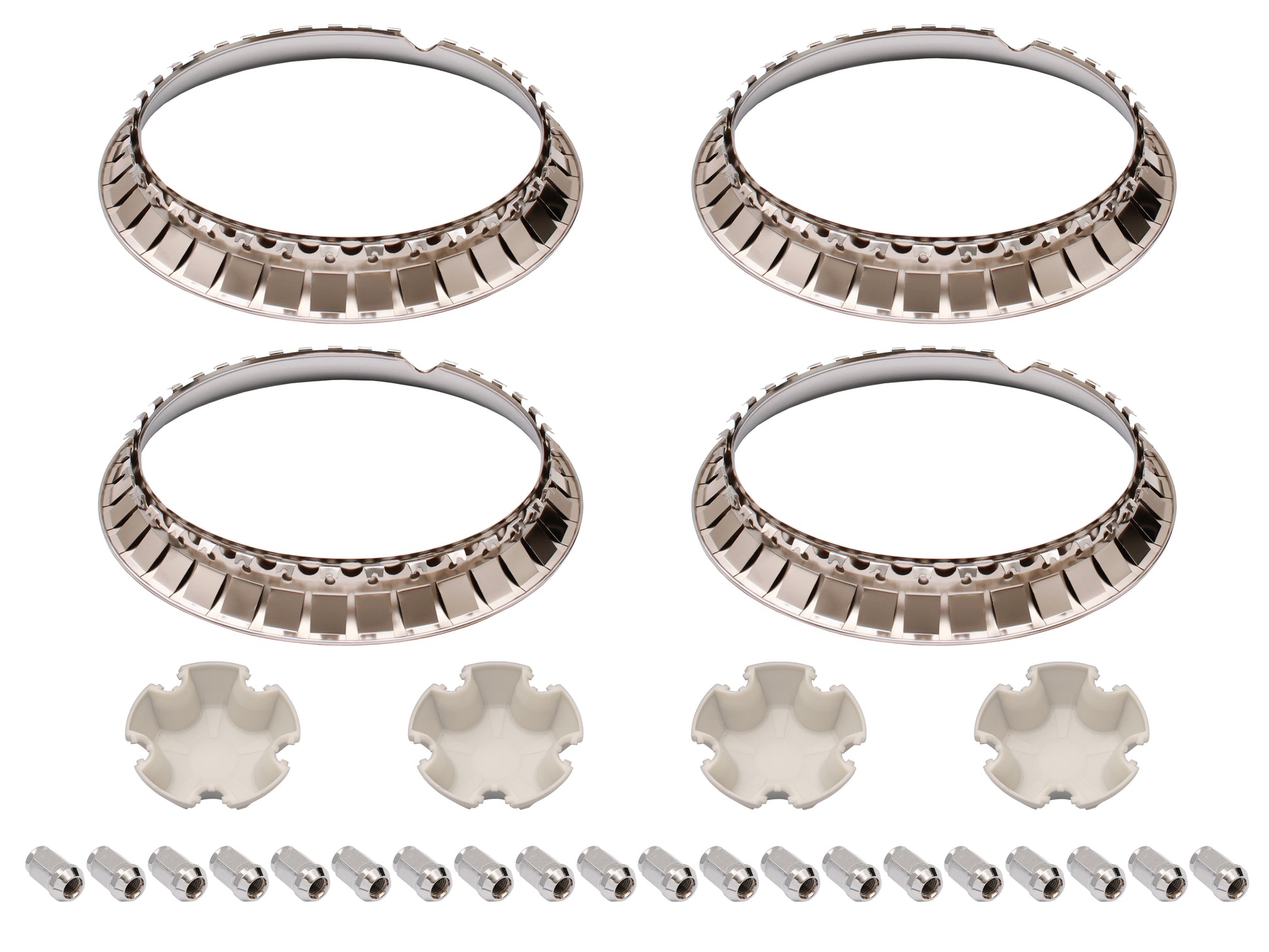 Complete kit for 4 wheels: Includes wheel trims, centre caps, and nuts to cover one axle, offering a full restoration solution.